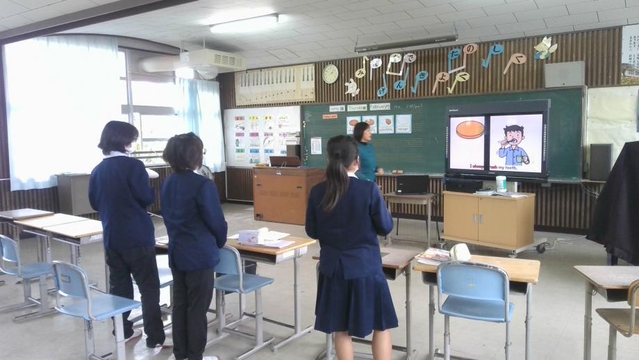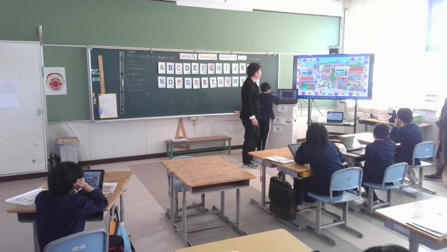 また、3・4年生の外国語活動の授業は、アルファベットの大文字に関する学習でした。学級担任の先生と垂水市教育委員会の日本人英語講師の先生のティーム・ティーチングの授業でした。子供たちは、大型テレビを使ったり、カードを使ったゲームをしたりして、楽しく英語のアルファベットの大文字に慣れ親しんでいました。