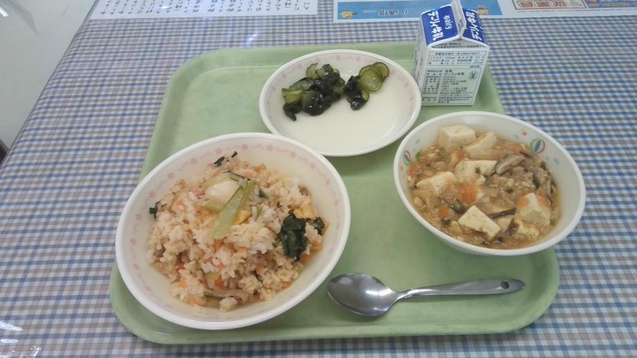 3月1日の給食のメニューは、キムチチャーハン、マーボーどうふ、きゅうりとわかめのすのもの、牛乳でした。