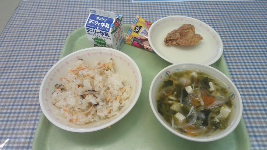 3月日日の給食のメニューは、ちらしずし、てまりふのすましじる、とりのからあげ、ひなあられ、牛乳でした。