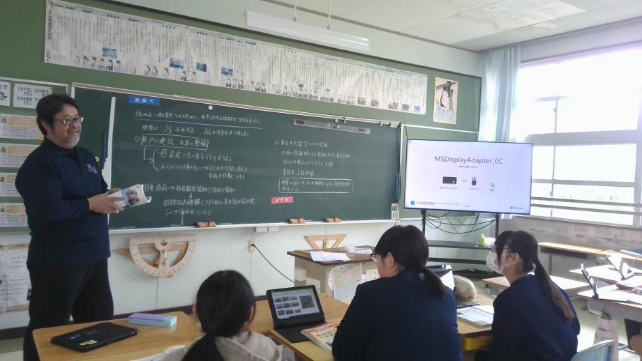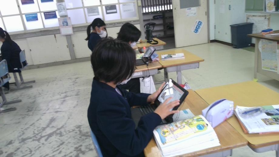 6年生は、社会科の授業に教科書、地図帳、タブレット端末を活用して落ち着いて取り組んでいました。