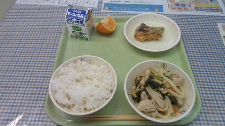 3月14日の給食は、すくなめごはん、さんさいうどん、かんぱちのてんぷら、牛乳、デコポンでした。