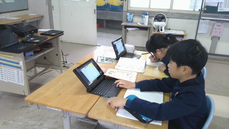 6年生は、自分の一番の思い出をこれまで学習した英語を活用して発表するための準備に取り組んでいました。5年生と同様に、タブレットを活用して、写真やイラスト等を効果的に活用して発表原稿を作成していました。来週の外国語科の授業は、5年生との交流です。